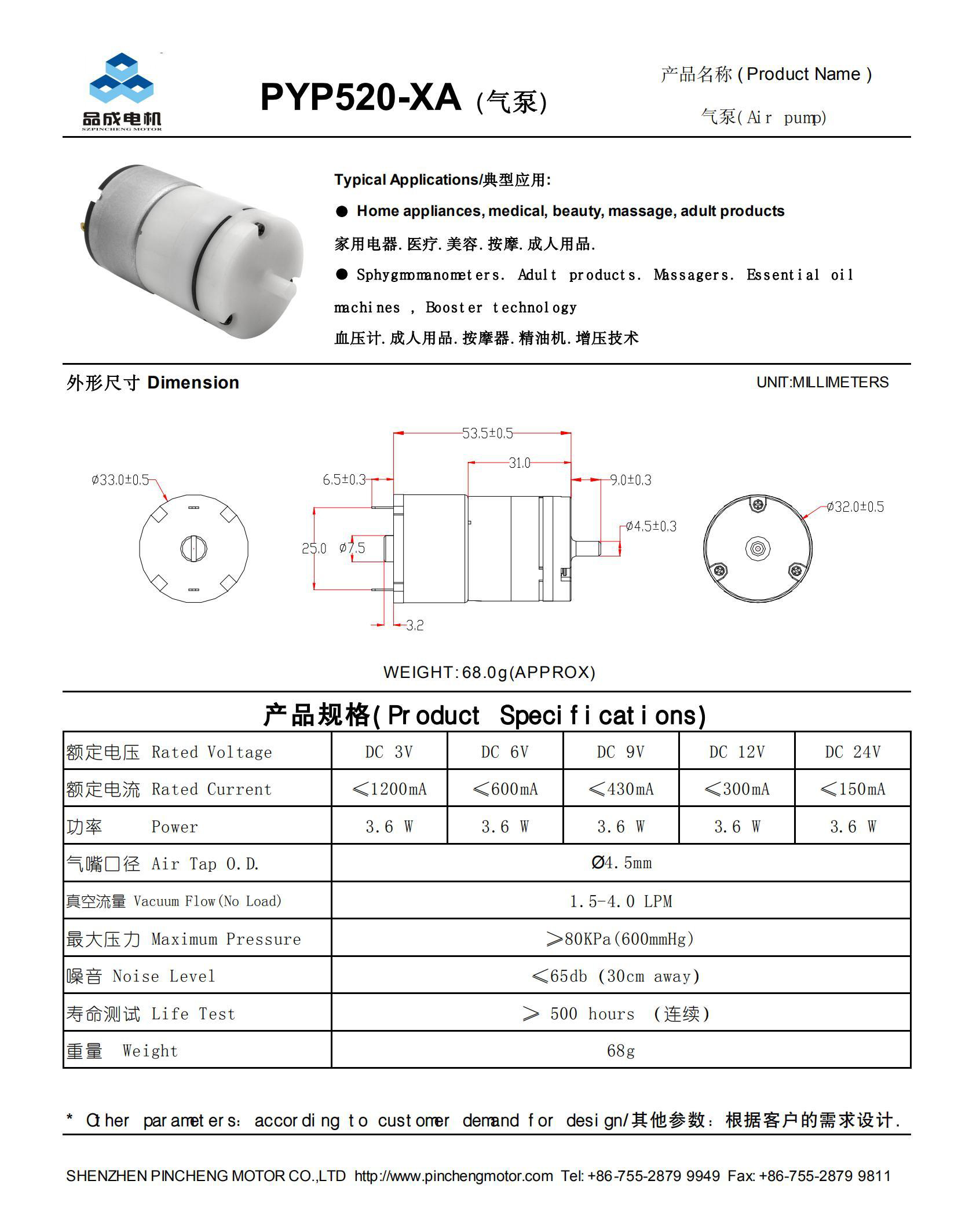 訂貨號 520 類型 氣體傳輸泵 貨號 PYP520氣泵